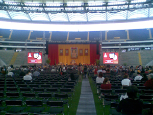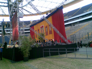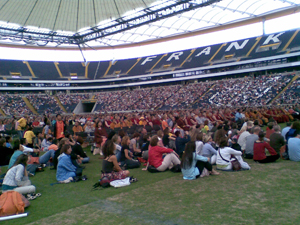 So betraten wir zum ersten mal die riesige Commerzbank Arena. Ich hatte mal ein wenig im Internet recherchiert. In die Arena passen 50.000 Menschen. Wohl auch aus dem Grund sah es trotz 10.000 Besucher, ziemlich leer in der Arena aus. Vor allem betonten die Veranstalter mehrmals, dass sie bei der Veranstaltung drauflegen mussten und baten mehrmals um weitere Spenden.