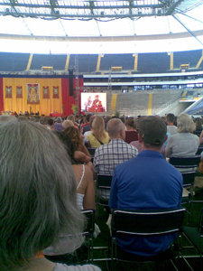 Samstag und Sonntag bekleidete uns Anja, eine liebe Freundin von mir. An den beiden Tagen war Puplic Talk angesagt. Zusammen mit Prof. Götz Werner (der Gründer von dm-drogerie-markt), Prof. Dr. Mojib Latif (Klimaforscher und Meteorologe), Prof. Dr. Karl-Heinz Brodbeck (seine Wirtschaftsethik verbindet die Ursache-Wirkungsprinzipien mit der Weisheit buddhistischer Gelehrter) und dem Moderator Gert Scobel (preisgekrönter Kultur- und Wissenschaftsjournalist) erörterte der Dalai Lama wichtige Themen, wie zum Beispiel: Was bedeuten globale Verantwortung, Wirtschaftsethik und Umweltbewusstsein im normalen Alltag?